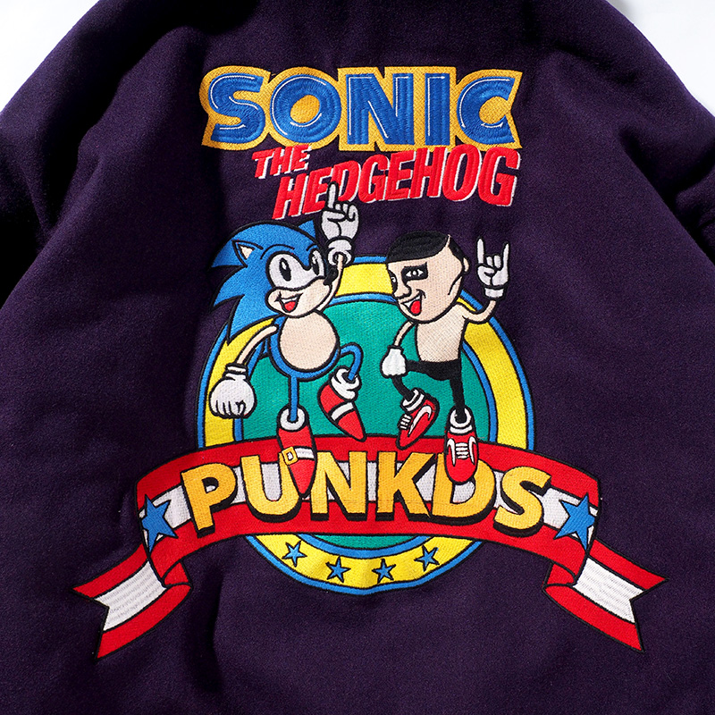 SEGAのキャラクター「SONIC」とコラボしたスタジャンになります。ソニックのことを「音速針鼠」と表現しているのが斬新です!バックプリントにはソニックの格好をした「あいつ」がいてとてもカッコいいアイテムになってます。