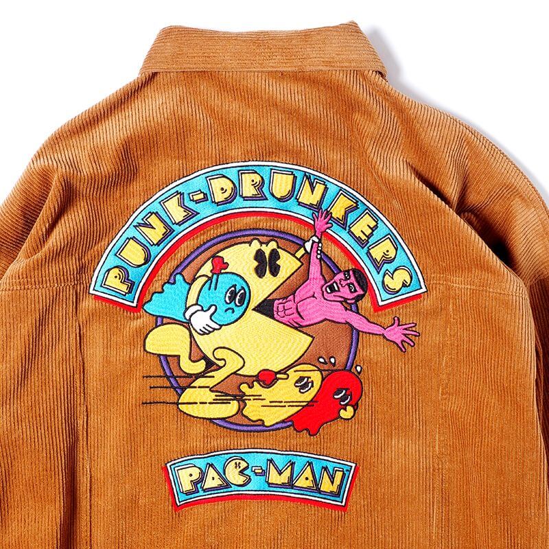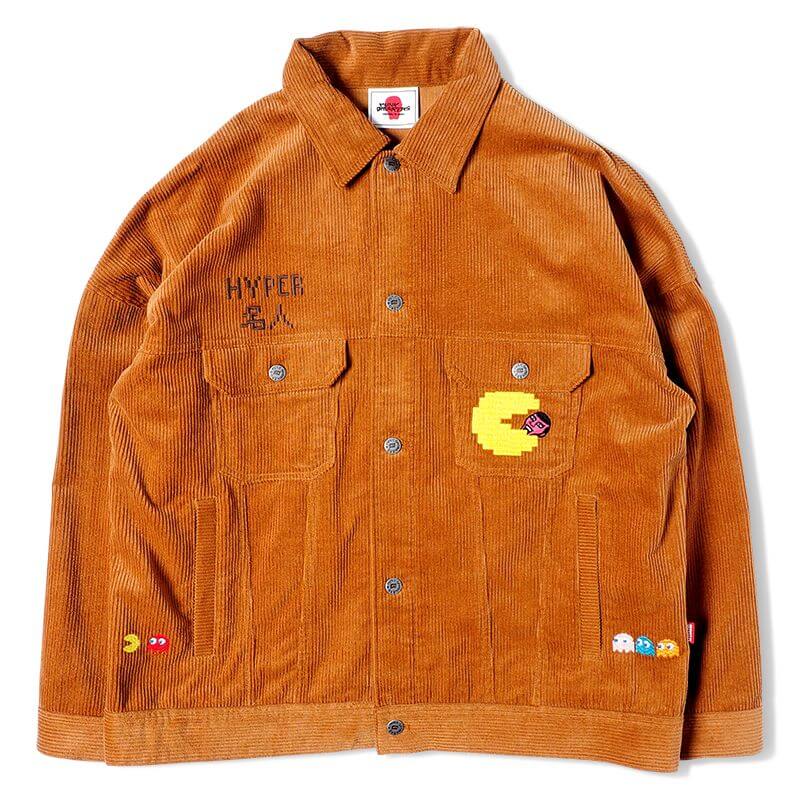 ナムコの代表作である「PACーMAN」とコラボしたコーデュロイ生地のジャケットです。胸ポケットにパックマンのドット絵が刺繍されていて、バックプリントでは「あいつ」がパックマンに食べられているデザインとなってます。コーデュロイ生地がオシャレなアイテムです!