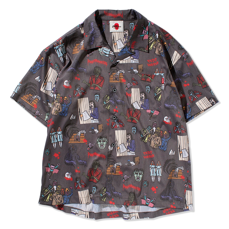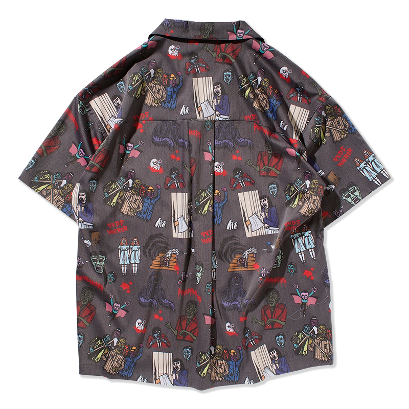 2022年のサマーコレクションの新作のアロハシャツになります。ホラーだけどポップなイラストが一面に描かれています。サマーコレクションの中でも僕が一番いいなと思ったアイテムです!